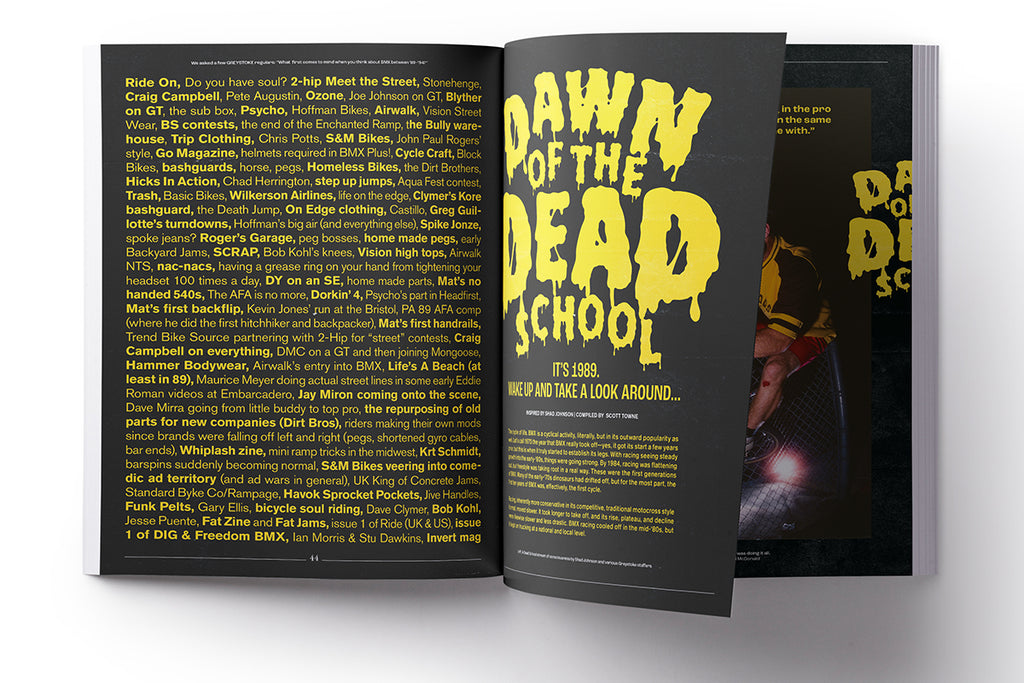 "Time waits for no one. Greystoke Issue 3 is a bit tardy, but “Dead School” is in session. In our latest, full-sized print magazine, focusing on the “dead” years of BMX from 1988-94, we go 132 pages deep with a Brad McDonald photo feature, Dave Voelker interview, rare bikes, unseen photos and an in-depth look at how much noise was being made when BMX had gone quiet. Remember, “It's okay to look back at the past. Just don't stare.” Greystoke Issue 3 will be shipping from week beginning December 15th"